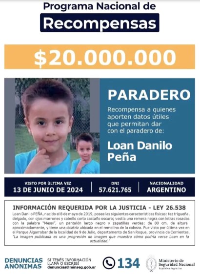 El Ministerio de Seguridad de la Nación difundió una nueva imagen con la progresión de edad del niño Loan Danilo Peña, quien tenía 5 años cuando fue visto por última vez el 13 de junio de 2024 en un naranjal cercano a la casa de su abuela, en el paraje Algarrobal de la localidad de 9 de Julio, Corrientes. Ofrecen $20 millones a quienes aporten datos útiles que permitan dar con su paradero.