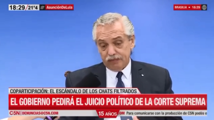 “Es algo de lo que estoy absolutamente convencido, en lo que siempre creí; planteé que la justicia se revise a sí misma y esperaba que hiciera algo, pero evidentemente no lo hace y hemos llegado a una situación límite”, afirmó el Presidente sobre el pedido de juicio político, del que buscará tener el respaldo de varios gobernadores.