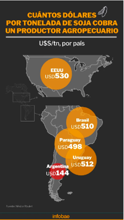 Un informe del analista, productor agropecuario y ex secretario de Valor Agregado de La Nación, Néstor Roulet, reflejó que el productor argentino cobra un precio por tonelada de USD 144, mientras que en Uruguay USD 512 (256% más), en Brasil USD 510 (254% más), en Paraguay USD 498 (245% más) y en Estados Unidos USD 530 (268% más).