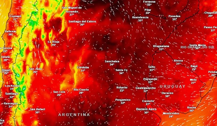 De todas formas, la temperatura se mantendrá acorde a la época del año en el extremo norte del territorio, donde se pueden alcanzar máximas de 30°C y los 33°C, y para el centro del país las máximas rondarán los 35°C y los 38°C, con viento soplando del sector norte, dentro de un marco bastante caluroso en la región pampeana.