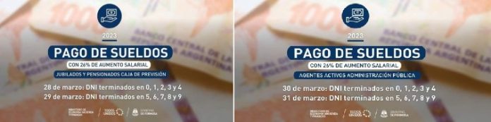 El martes 28 se abonarán los sueldos correspondientes al mes de marzo, con el 26% de aumento salarial, pertenecientes al primer tramo del aumento del 50%. Además se dispone un 20% en las Asignaciones Familiares y la vigencia de $120.000 de los salarios mínimos de bolsillo garantizados, sin incluir las asignaciones familiares.