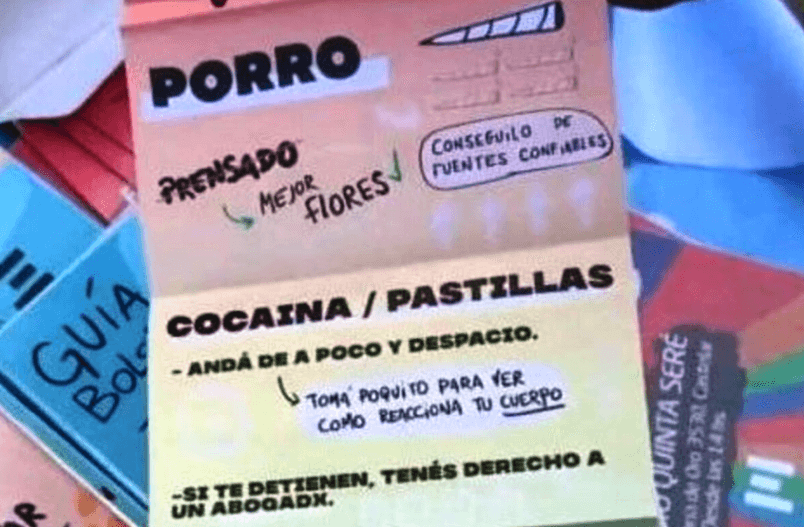 «Si vas a consumir tené en cuenta estos consejos», dice el flyer en la parte superior, y luego detalla: «Cocaína/pastillas: andá de a poco y despacio. Tomá poquito para ver cómo reacciona tu cuerpo. Si te detienen, tenés derecho a un abogado».