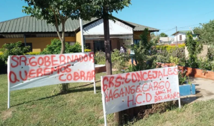 Los trabajadores de planta permanente y temporaria del Concejo Deliberante de la localidad de General Belgrano llevan adelante un reclamo ante la falta de pago de sus haberes. Con carteles instalan su planteo a los concejales, ya que este mes no percibieron sus sueldos.