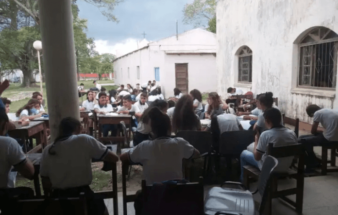 Ahora con el inicio de las clases, alumnos y profesores se arreglaron debajo de árboles con 43 grados de temperatura para poder empezar.