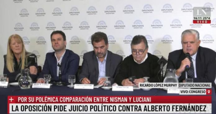 El interbloque de Juntos por el Cambio en Diputados anunció este jueves en conferencia de prensa que presentó un pedido de juicio político contra Alberto Fernández por sus dichos contra Diego Luciani y la comparación con el fallecido fiscal Alberto Nisman.