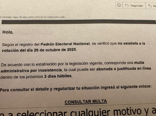 Tras las elecciones legislativas del último domingo, la Cámara Nacional Electoral (CNE) emitió una advertencia pública por una nueva modalidad de estafa virtual que apunta a los ciudadanos que no votaron. A través de un correo electrónico falso, identificado como [email protected], los estafadores intentan hacer creer que el mensaje proviene del portal oficial MiArgentina y solicitan el pago inmediato de una supuesta multa por inasistencia a los comicios.