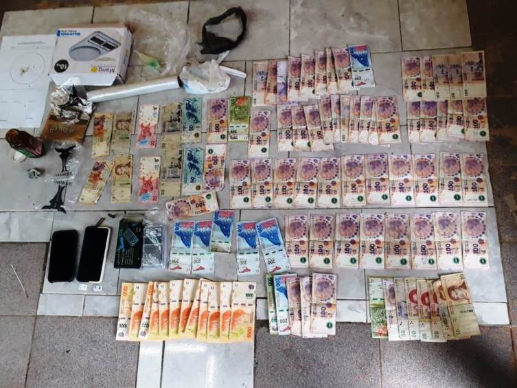 De esa manera la primera requisa domiciliaria fue realizada en el domicilio ubicado en el barrio Gendarmería Nacional de la localidad de El Espinillo, donde procedieron al secuestro de más de $ 20.000 pesos de dinero en efectivo, picadura de marihuana, dos teléfonos celulares, restos de polietileno utilizados para el almacenamiento de sustancias, una balanza electrónica de precisión, dos chips, dos proyectiles, papel engomado utilizado para el armado de porros, y la detención de un hombre mayor de edad.