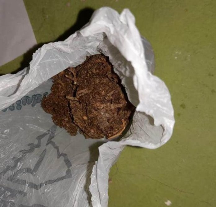 Durante la requisa de seguridad en presencia de testigos se halló en uno de los bolsillos de la prenda que vestía un envoltorio de polietileno que contenía una sustancia vegetal el que tras prueba de reactivación química dio como resultado positivo para marihuana.