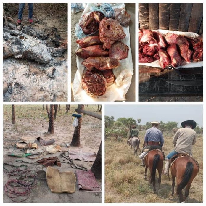 En un inicio con el seguimiento se huellas, partiendo del lugar del hecho, la comisión policial llegó hasta un campo ubicado en zona rural de Loma Tuyuyú de Laguna Blanca, donde el puestero al notar la presencia policial se dio a la fuga, encontrando los investigadores en las cercanías la faena clandestina incinerada de uno de los vacunos, que fue reconocido en el lugar por el propietario como el sustraído.