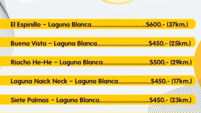 Las salidas desde Riacho He Hé a Laguna Blanca estarán $500 y los horarios de salida son a las 17.30, 18, 18.30, 19, 19.30 y 20 horas, mientras que desde Laguna Naineck a las 17.30, 18.30, 19.30 y 20.30 horas con un precio de $450.