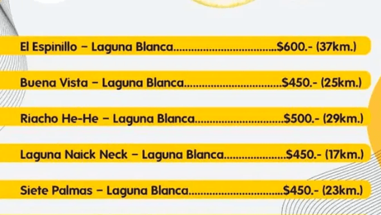 En cuanto a la tarifa desde Formosa a Laguna Blanca, será de $1750. (expresdiario.com)