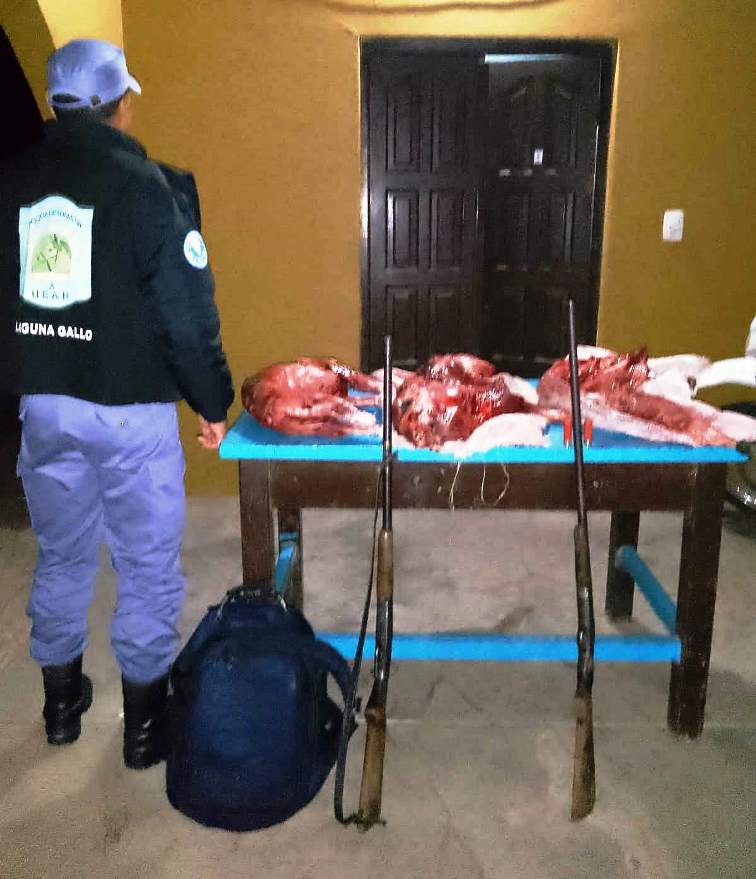 Efectivos de la Unidad Especial de Asuntos Rurales (UEAR), Laguna Gallo, realizaron recorridas por la Ruta Provincial N° 20, donde demoraron a dos hombres y secuestraron armas de fuego, cartuchos, mochila y dos reses de jabalí.