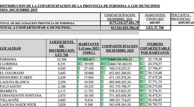 La reciente difusión de la Resolución N.º 9500/25 del Ministerio de Gobierno, Justicia, Seguridad y Trabajo de la provincia de Formosa volvió a poner bajo la lupa la situación financiera de los municipios del interior, en un contexto de crisis que ya se hizo visible en localidades como Clorinda, Gran Guardia y otras. En ese marco, los datos oficiales revelan que Laguna Naineck recibió en diciembre de 2025 un total de $ 363.438.565,18 en concepto de coparticipación, una cifra significativa para una comunidad de escala pequeña y mediana.