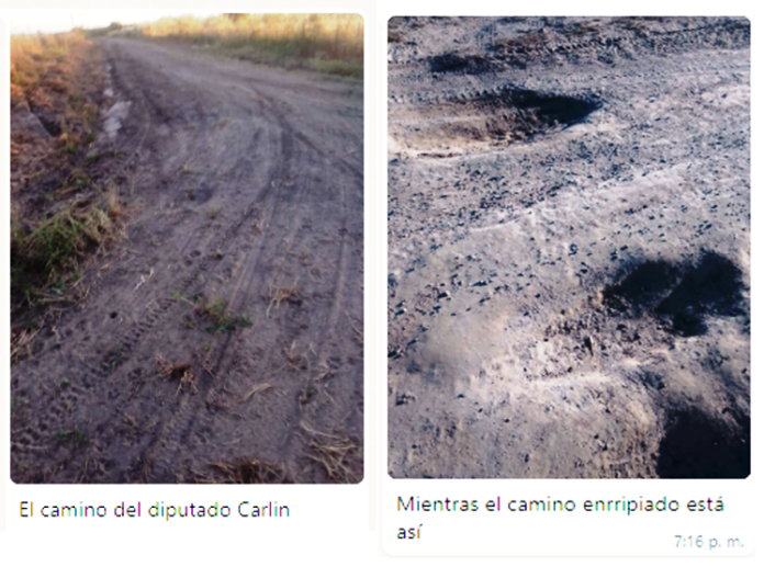 “Te mando estas fotos para mostrar como son privilegiadas nuestras autoridades del gobierno mientras los vecinos seguimos sufriendo los malos caminos”, expresó un productor quien expuso que operarios de vialidad repararon el camino de acceso a la finca de un diputado de la zona, vinculado al gobierno provincial, dejando de lado la reparación de la ruta provincial.