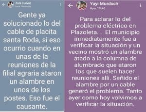“Ante la gravedad de las acusaciones que son improcedentes, maliciosas e infundadas del Intendente de Laguna Naineck Julio Evaristo Murdoch y de la funcionaria municipal de esta localidad Zunilda Cuevas donde pretenden mediante sus redes sociales (Estados de WhatsApp) responsabilizarnos a quienes acostumbramos a realizar reuniones de productores agropecuarios del mal funcionamiento de las instalaciones eléctricas de la Plazoleta Santa Rosa de Lima de nuestra localidad, donde días atrás se produjera un incidente que puso en riesgo la vida de un niño, procedí a intimarlos mediante una carta documento”, publicó Pánfilo Ayala en su cuenta del Facebook.