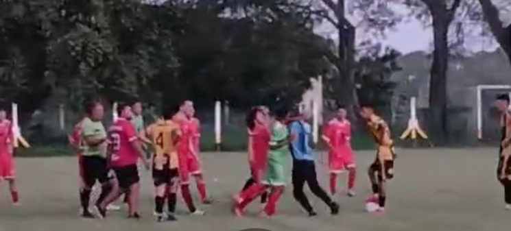 El momento más grave se produjo cuando, en medio del tumulto, el arquero del equipo local intentó intervenir para calmar los ánimos y terminó recibiendo un violento golpe de puño en el rostro por parte de un jugador del conjunto visitante. Este hecho, considerado de extrema gravedad, derivó en la suspensión del partido “por falta de garantías”, una decisión que, aunque necesaria, dejó expuesta la incapacidad de asegurar condiciones mínimas de seguridad dentro del campo de juego.