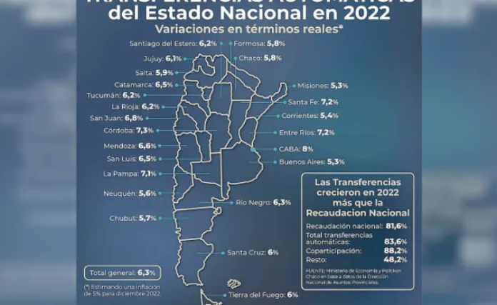 Según el análisis de la consultora Politikon Chaco, en base a datos de la Dirección Nacional de Asuntos Provinciales del Ministerio de Economía, «los envíos totales del 2022 no sólo son superiores al 2021 en términos reales, sino que también superan a los años previos: se ubican 13,9% por encima de 2020; 9,1% vs. 2019; 7,5% contra 2018 y 15,1% frente a 2017».
