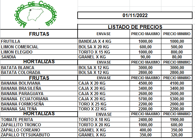 MERCADO DE CORRIENTES: Precios de FRUTAS y HORTALIZAS – 01/11/2022