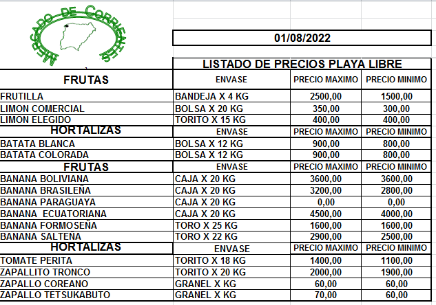 MERCADO DE CORRIENTES: Precios de FRUTAS y HORTALIZAS – 01/8/2022