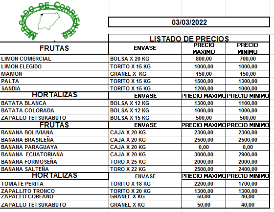 MERCADO DE CORRIENTES: Precios de FRUTAS y HORTALIZAS – 03/3/2022 4 marzo, 2022 628 FacebookXPinterestWhatsApp
