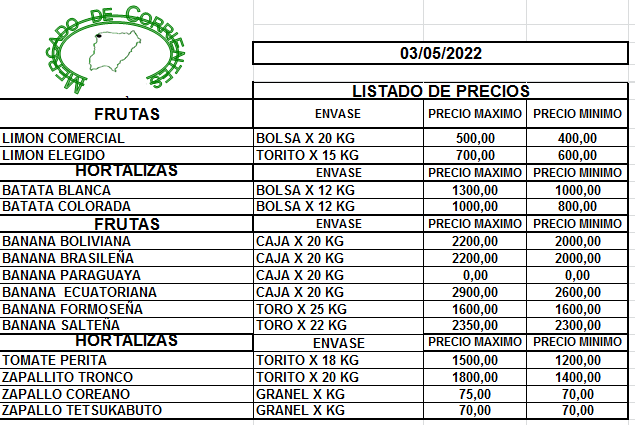 MERCADO DE CORRIENTES: Precios de FRUTAS y HORTALIZAS – 03/5/2022 4 mayo, 2022 685 FacebookXPinterestWhatsApp