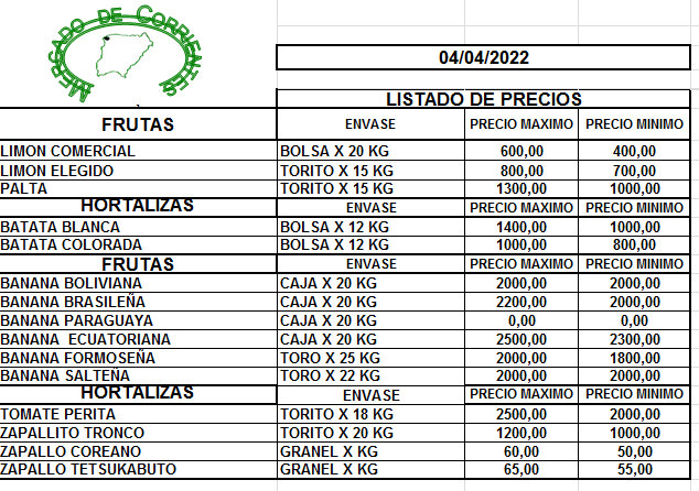 MERCADO DE CORRIENTES: Precios de FRUTAS y HORTALIZAS – 04/3/2022 5 abril, 2022 560 FacebookXPinterestWhatsApp