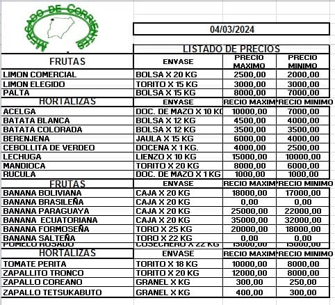 MERCADO DE CORRIENTES: Precios de FRUTAS y HORTALIZAS – 04/3/2024