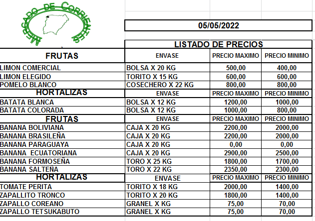 MERCADO DE CORRIENTES: Precios de FRUTAS y HORTALIZAS – 05/5/2022 6 mayo, 2022 617 FacebookXPinterestWhatsApp