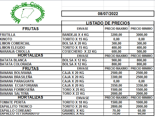 MERCADO DE CORRIENTES: Precios de FRUTAS y HORTALIZAS – 08/7/2022 11 julio, 2022 509 FacebookXPinterestWhatsApp