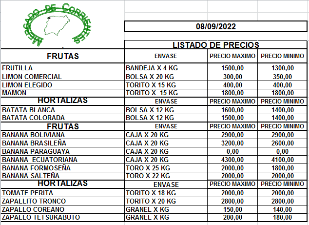MERCADO DE CORRIENTES: Precios de FRUTAS y HORTALIZAS – 08/9/2022