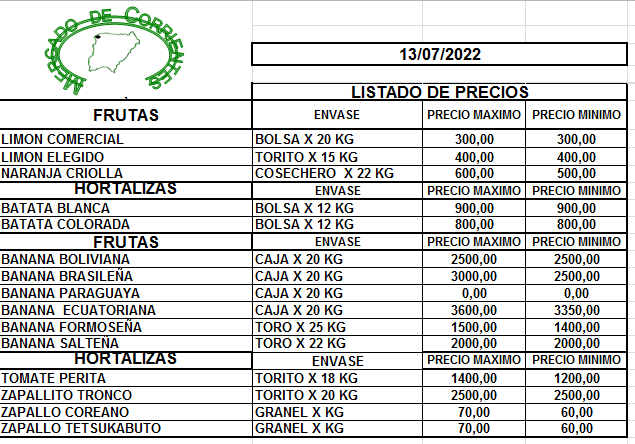 MERCADO DE CORRIENTES: Precios de FRUTAS y HORTALIZAS – 13/7/2022