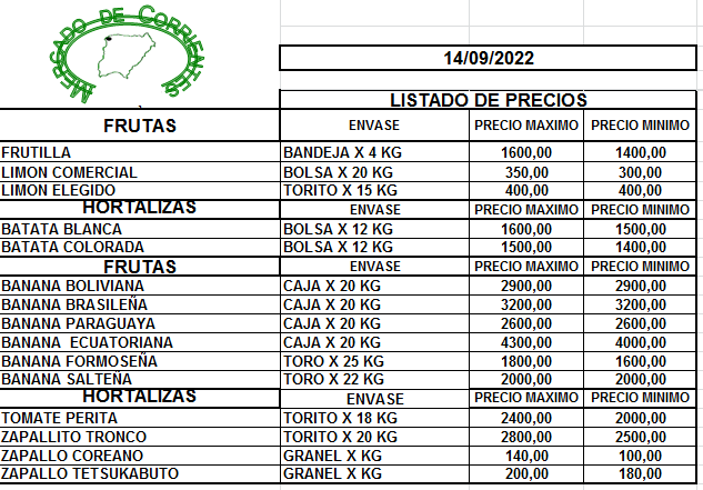 MERCADO DE CORRIENTES: Precios de FRUTAS y HORTALIZAS – 14/9/2022 15 septiembre, 2022 452 FacebookXPinterestWhatsApp