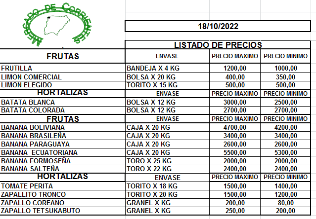 MERCADO DE CORRIENTES: Precios de FRUTAS y HORTALIZAS – 18/10/2022