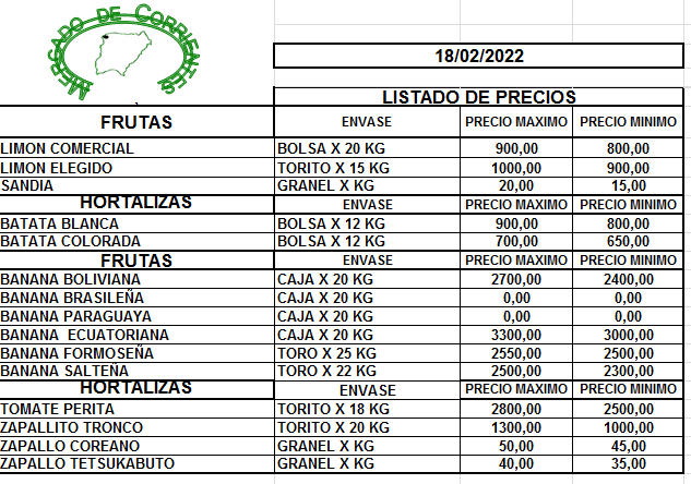 MERCADO DE CORRIENTES: Precios de FRUTAS y HORTALIZAS – 18/2/2022 21 febrero, 2022 633 FacebookXPinterestWhatsApp