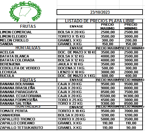 MERCADO DE CORRIENTES: Precios de FRUTAS y HORTALIZAS – 23/10/2023