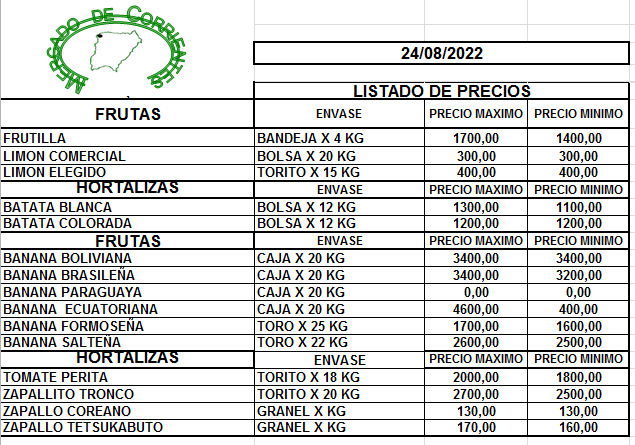 MERCADO DE CORRIENTES: Precios de FRUTAS y HORTALIZAS – 24/8/2022 25 agosto, 2022 422 FacebookXPinterestWhatsApp