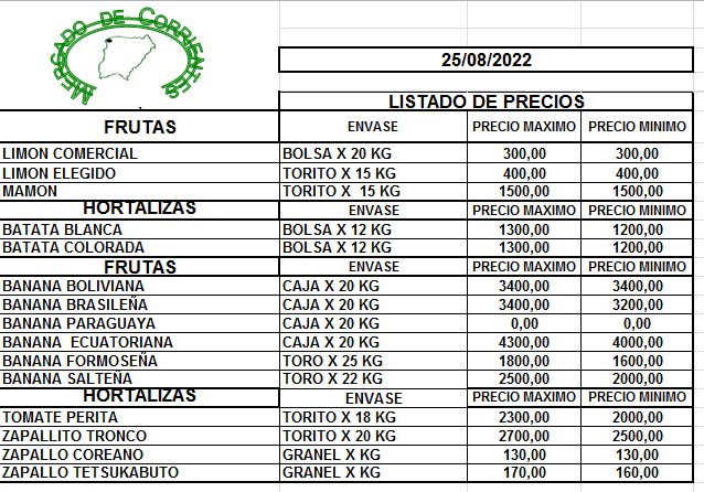 MERCADO DE CORRIENTES: Precios de FRUTAS y HORTALIZAS – 25/8/2022 26 agosto, 2022 460 FacebookXPinterestWhatsApp