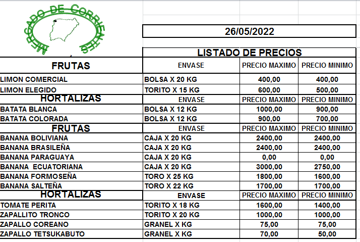 MERCADO DE CORRIENTES: Precios de FRUTAS y HORTALIZAS – 26/5/2022 27 mayo, 2022 502 FacebookXPinterestWhatsApp