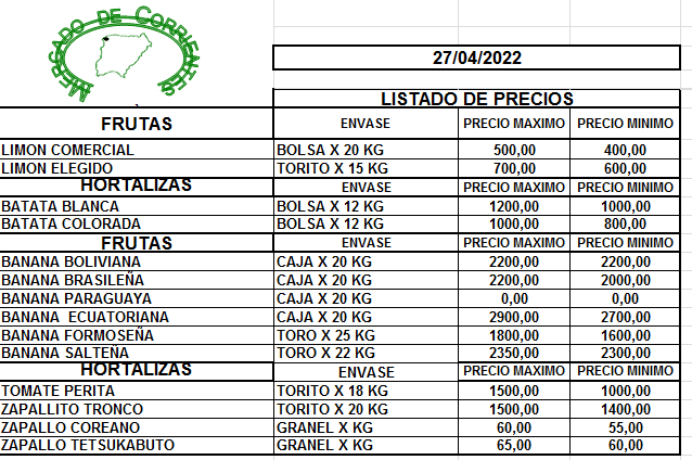 MERCADO DE CORRIENTES: Precios de FRUTAS y HORTALIZAS – 27/4/2022