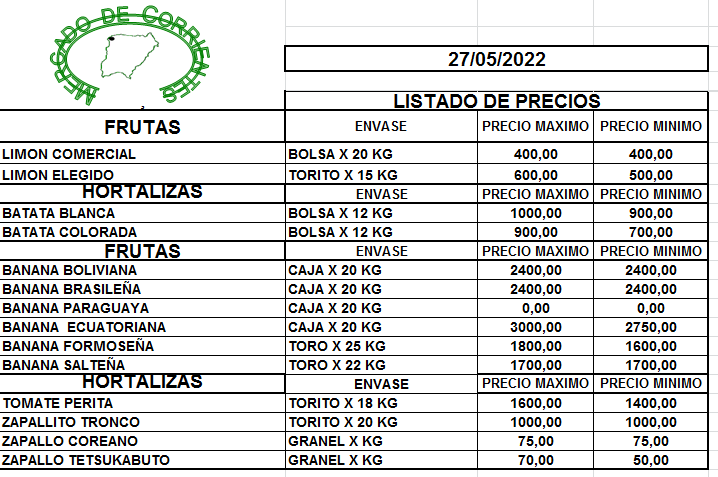 MERCADO DE CORRIENTES: Precios de FRUTAS y HORTALIZAS – 27/5/2022 30 mayo, 2022 703 FacebookXPinterestWhatsApp