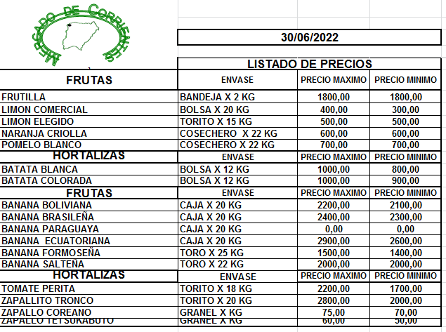 MERCADO DE CORRIENTES: Precios de FRUTAS y HORTALIZAS – 30/6/2022