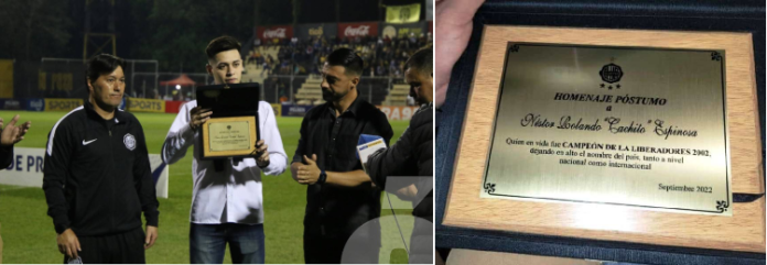 Ambos clubes le rindieron un meritorio homenaje póstumo antes del encuentro jugado este lunes donde uno de los hijos de Cachito, Giovanni, encabezando una comitiva integrada por sus tíos Roberto, Danilo, Aldo, César y ex compañero del club Guaraní Eduardo Filippini, recibió dos plaquetas en su nombre, una por cada club.
