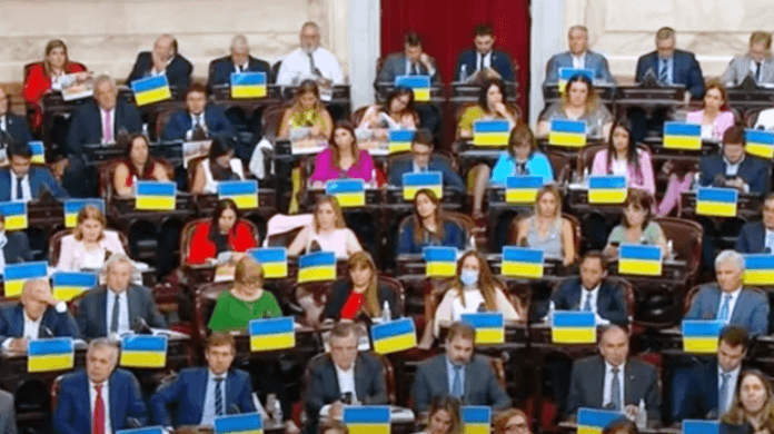 Una gran bandera azul y amarilla y pequeños carteles con los mismos colores pegados delante de las bancas fueron la forma en que los legisladores mostraron su descontento con la política exterior de la Casa Rosada ante la avanzada bélica dispuesta por el presidente de la Federación Rusa, Vladimir Putin.