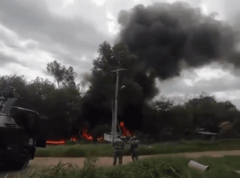 En imágenes y sonidos captados desde un celular, se perciben disparos y el inicio del incendio, presuntamente intencionado, de una parte del combustible que se extendió rápidamente por el sitio. No se reportaron hasta ahora heridos, pero la situación se mantiene tensa. (hoy.com)