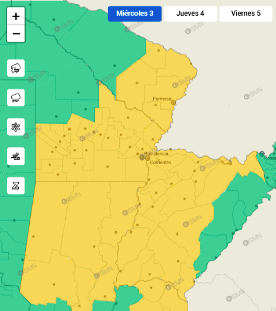 Alerta nivel AMARILLO por TORMENTAS LOCALMENTE FUERTES en vigencia para el norte de Santa Fe, noreste de Entre Ríos, centro, oeste, sur y norte de Corrientes, sur de Chaco y este de Formosa para lo que resta de este miércoles.