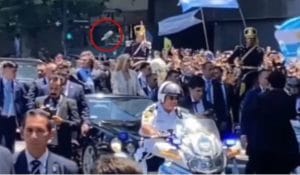 En ese momento, una persona del público les tiró una botella, que pasó a pocos centímetros de la cabeza del jefe de Estado. El objeto golpeó e hirió en la cabeza a uno de los integrantes de la custodia presidencial de la Policía Federal.